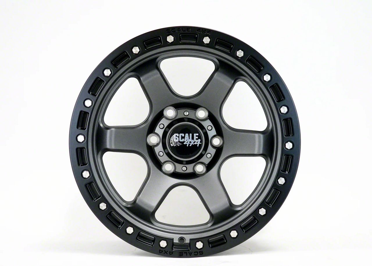 Scale 4x4 Wheels S03 Matte Gunmetal with Black Beadlock 6-Lug Wheel; 17x9; -25mm Offset This wheel features sophisticated styling that enhances your vehicle's appearance with refined design elements and premium craftsmanship. Its distinctive aesthetic provides an upgraded look that complements a wide range of vehicles. The thoughtful engineering ensures a proper fit while delivering lasting visual appeal.