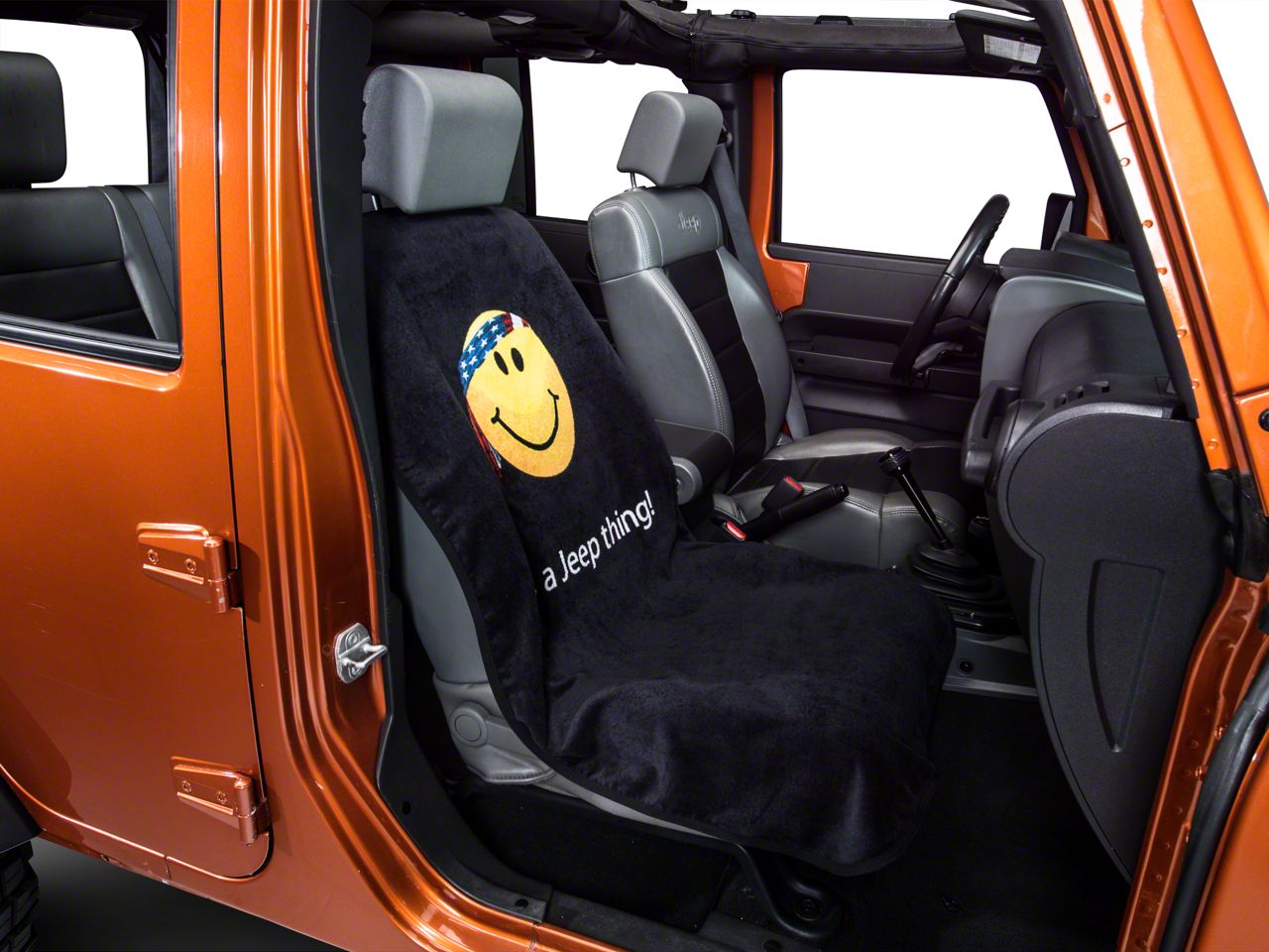 Protection. Bearing a cheery yellow smiley face and the legend "It's a Jeep Thing" on a handsome black seat cover with gray trim, Seat Armour's patented car seat towel fits onto your Jeep seats to absorb sweat, grit, dust, pet hair, spilled beverages, and anything else that might stain or dirty your seats. It slips neatly over the headrest and fits snugly on the rest of the seat for maximum coverage and comfort.Durable Construction. Seat Armour's car seat cover for Jeep Wranglers is made from 100% cotton terry and velour for maximum quality and comfort. In the event of an airbag deployment, the seat cover will be pushed safely out of the way rather than blocking the bag, since it is not strapped on. This versatile seat cover is fully machine washable.Application. Fits the front seats of all 1966-2026 Jeep CJ and Wrangler.