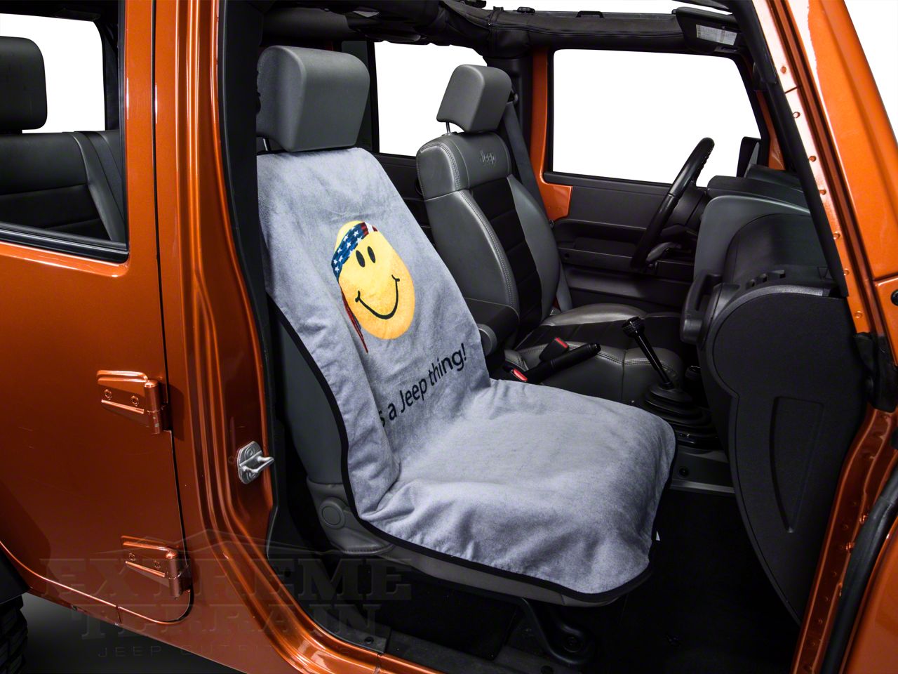 Function. Make everyone smile with a smiley faced seat cover from Seat Armor. The cover comes in a gray color It is made from a durable cotton terry/velour fabric that delivers performance and quality at the highest levels. It will protect your Jeep's seats from dirt, mud, spills, stains and more while still preserving the appearance, comfort, quality that is your Wrangler.