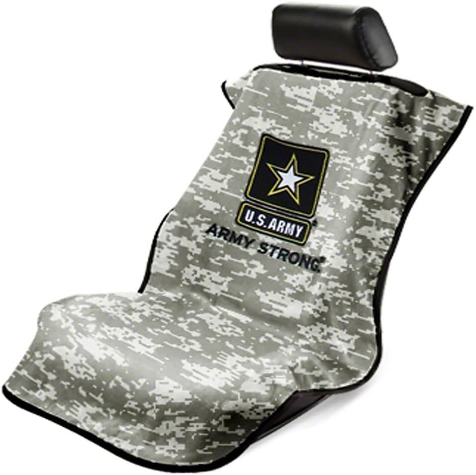 Rugged Build Quality. This car seat towel gets its impressive comfort and absorbent properties from rugged 100% cotton terry velour construction. Additionally, this seat towel is expertly sewn and features edging closures to prevent the material from unraveling. The US Army and Army Strong logos are then fully embroidered ensuring a design that stays vivid for years. Rounding out its construction is a fierce green camouflage design.
