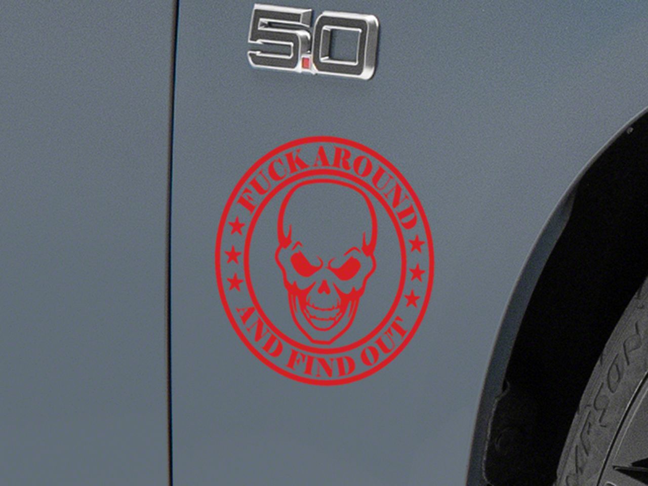 FAFO Skull Decal. A simple and inexpensive way to personalize the exterior styling of your vehicle is with a FAFO Skull Decal from SEC10. This Decal features a menacing skull design encircled with the text "F*ck Around and Find Out". This decal is ideal for those who stand on business.
