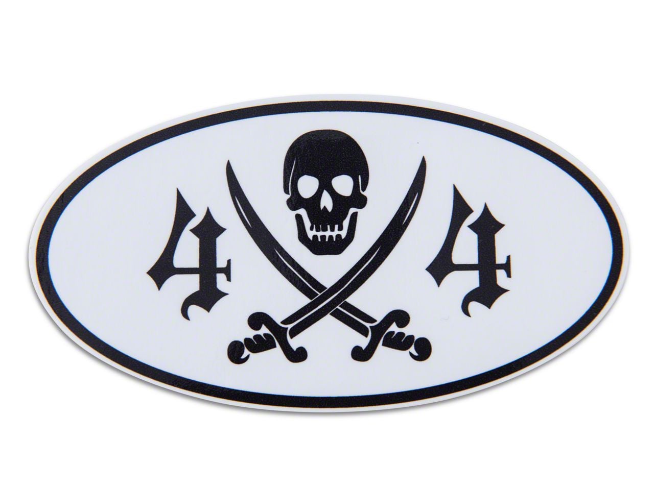 The Particulars. This bumper sticker style oval decal measures approximately 5.50 x 3 inches and features a black on white design of a pirate skull above a clever 4x4 redesign with crossed swords replacing the x. This decal will look great on your hard or soft top windows, Bronco's body, and many other places.