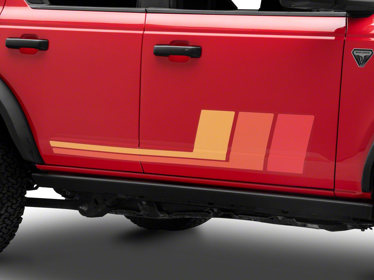 Application. These SEC10 Side Stripes; Retro are designed to fit 2021-2026 Ford Bronco models. Driver and passenger side included.