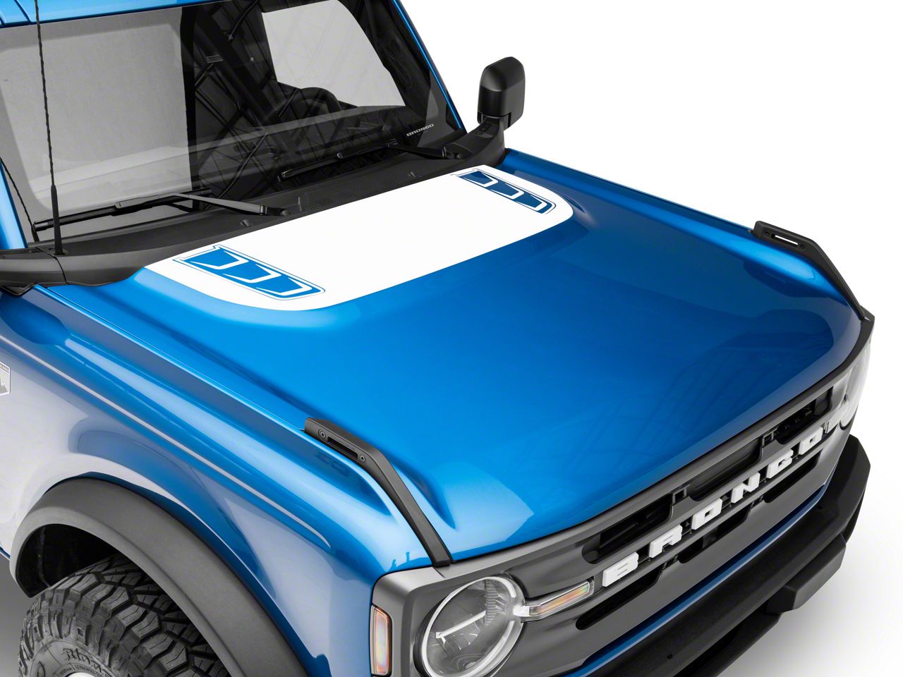 Hood Bulge Accent Decal. Accent the hood bulge found on your Bronco with this Sec10 Decal that features Faux Hood Vents. A white Sec10 Hood Bulge Decal is a simple and inexpensive way to personalize your Ford Bronco.