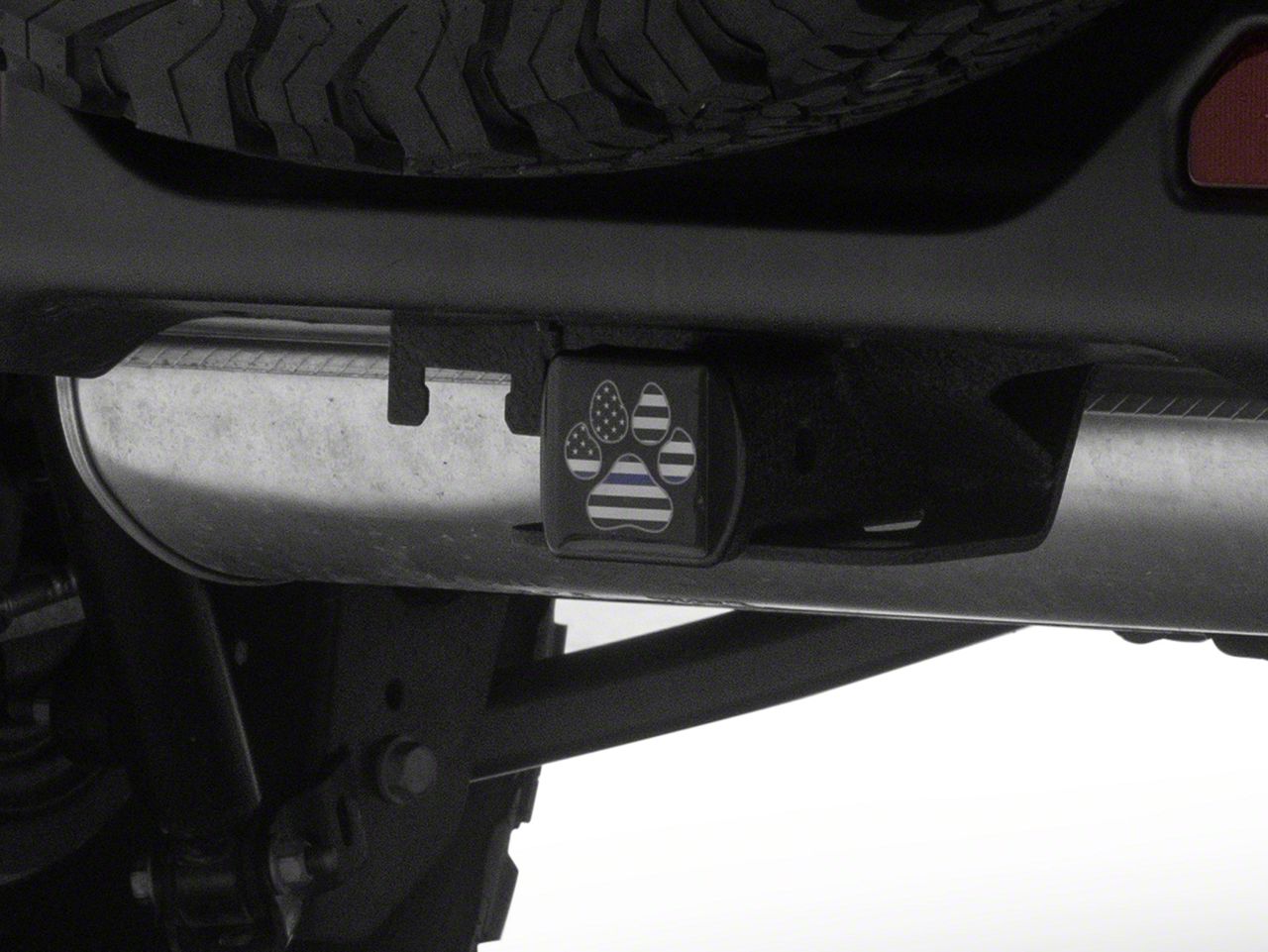 American Dog Paw Hitch Tube Cover Decal. This Hitch Tube Cover Decal features a black and white American Flag with blue stripe within a Dog Paw design. This Hitch Tube Cover Decal is a fun way to proudly show off your patriotism and support for the good old USA and its law enforcement agency's.