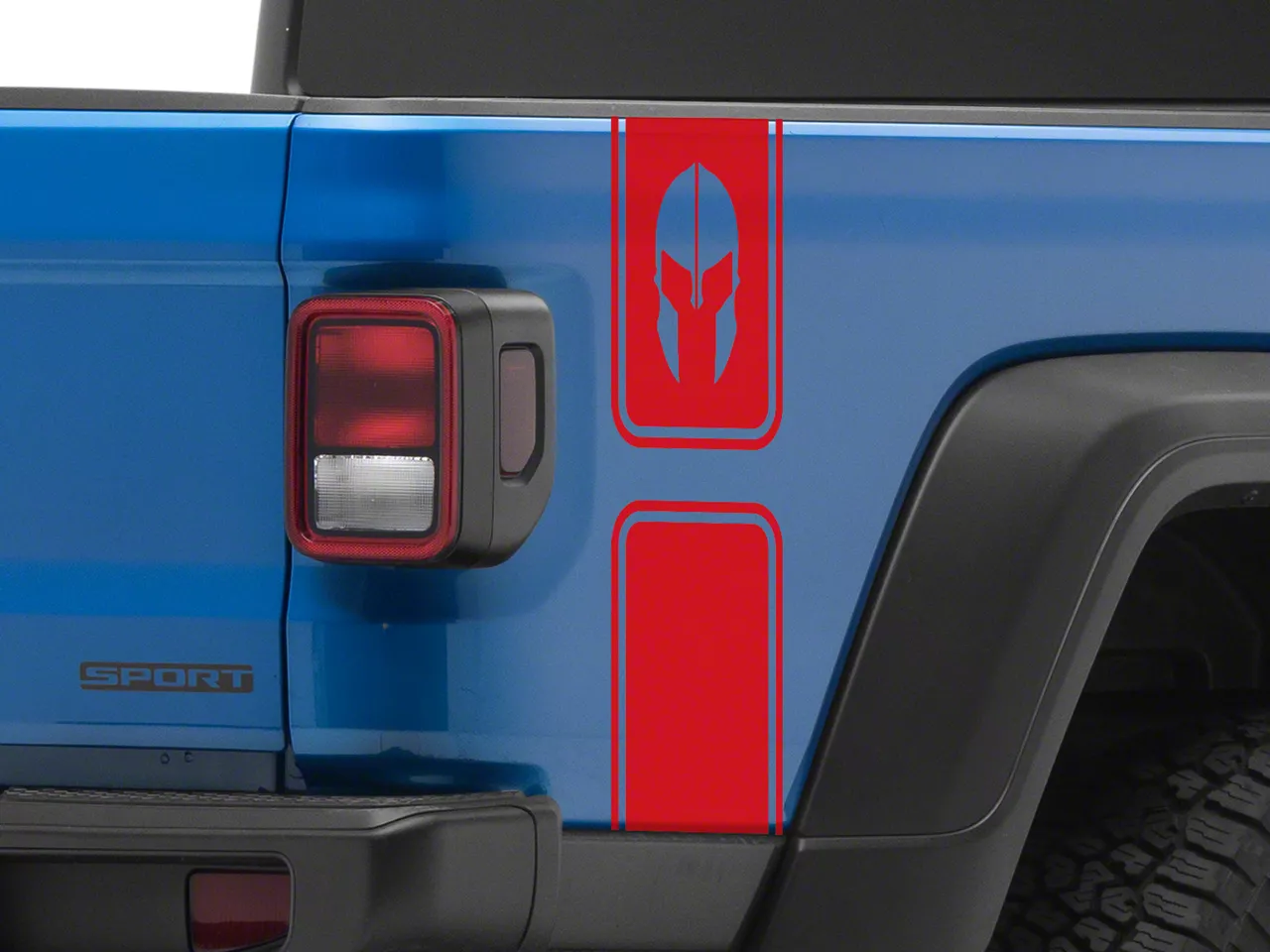 Application. This SEC10 Helmet Vertical Side Bed Graphics; Red is designed to fit 2020-2026 Jeep Gladiator JT models. Sold in Pairs.