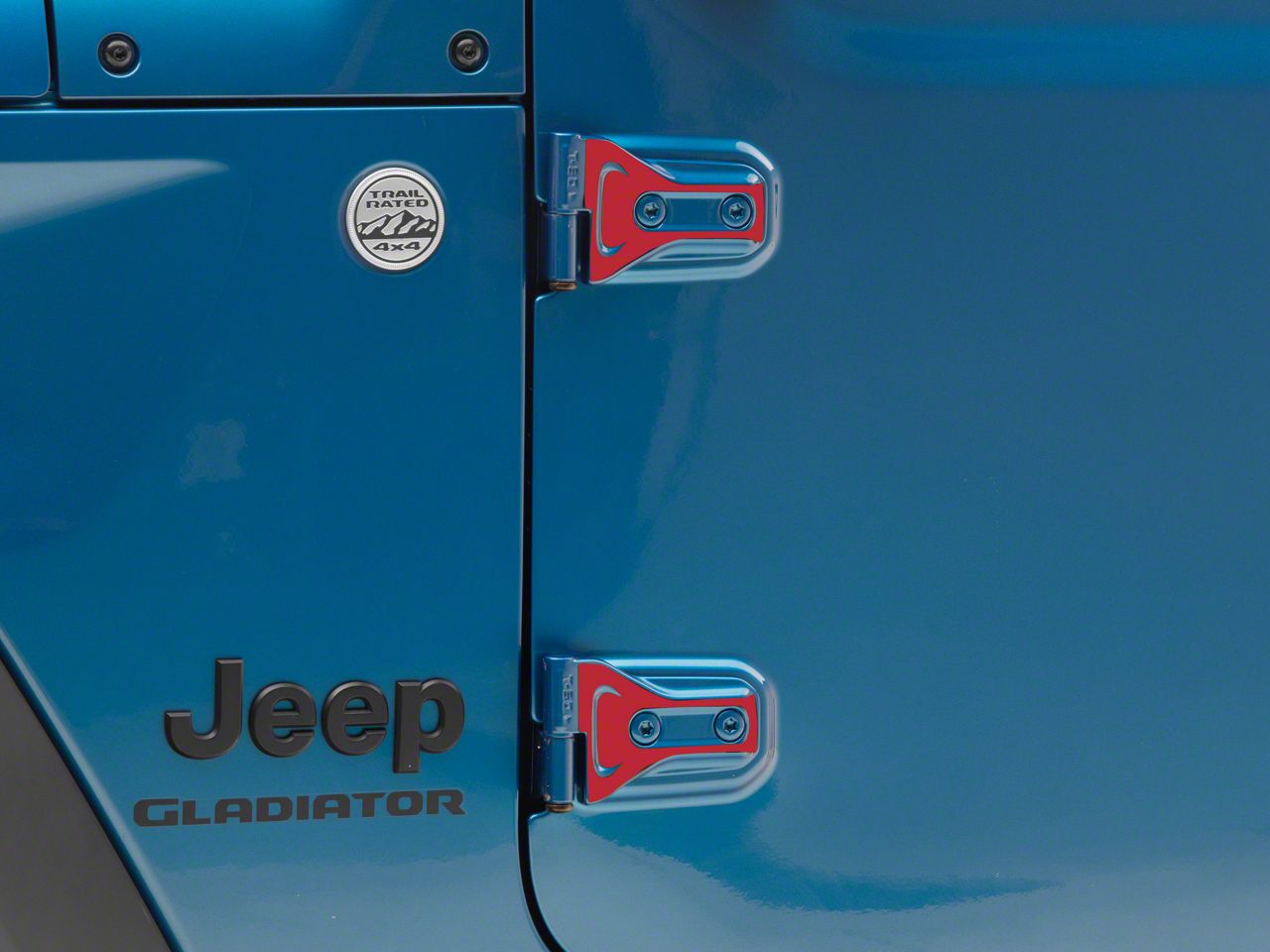 Exterior Door Hinge Accent Decals. SEC10's Door Hinge Accent Decals are an easy and inexpensive way to upgrade the exterior styling of your Jeep Gladiator. Designed to be applied directly over your Gladiator's exterior door hinges, these Accent Decals will give your Jeep an eye-catching, pop of color.