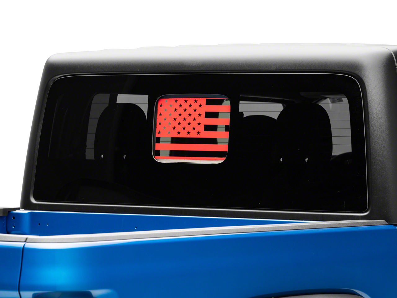 Application. This SEC10 Middle Window American Flag Decal; Red is designed to fit 2020-2026 Jeep Gladiator JT models. Please note that this rear window decal is designed to be applied to the outside of the glass only.