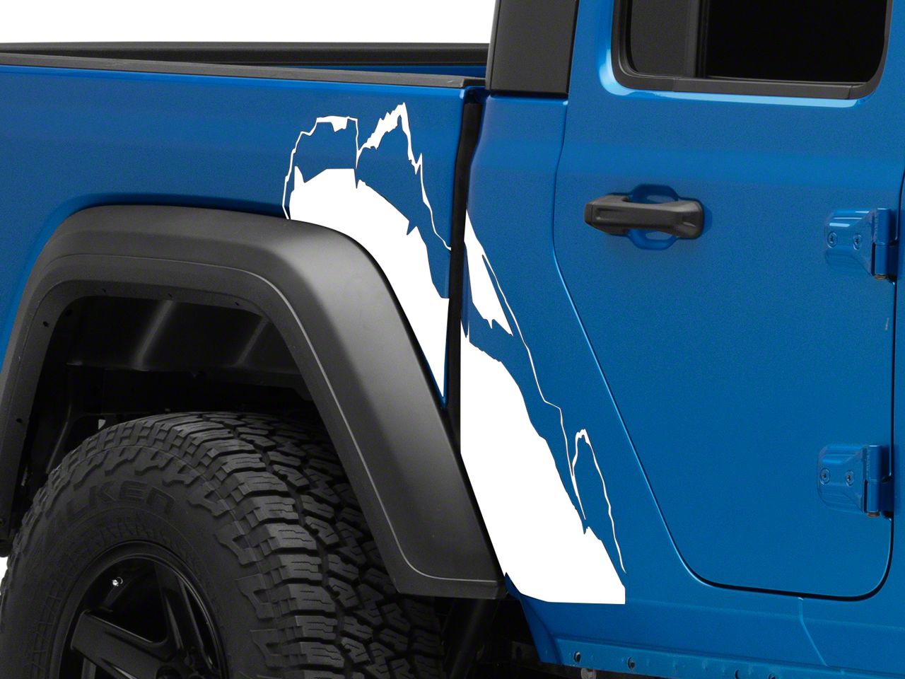 Application. These SEC10 Mountain Bed Side Decals; White are designed to fit 2020-2025 Jeep Gladiator JT models. Driver and passenger side decals included.