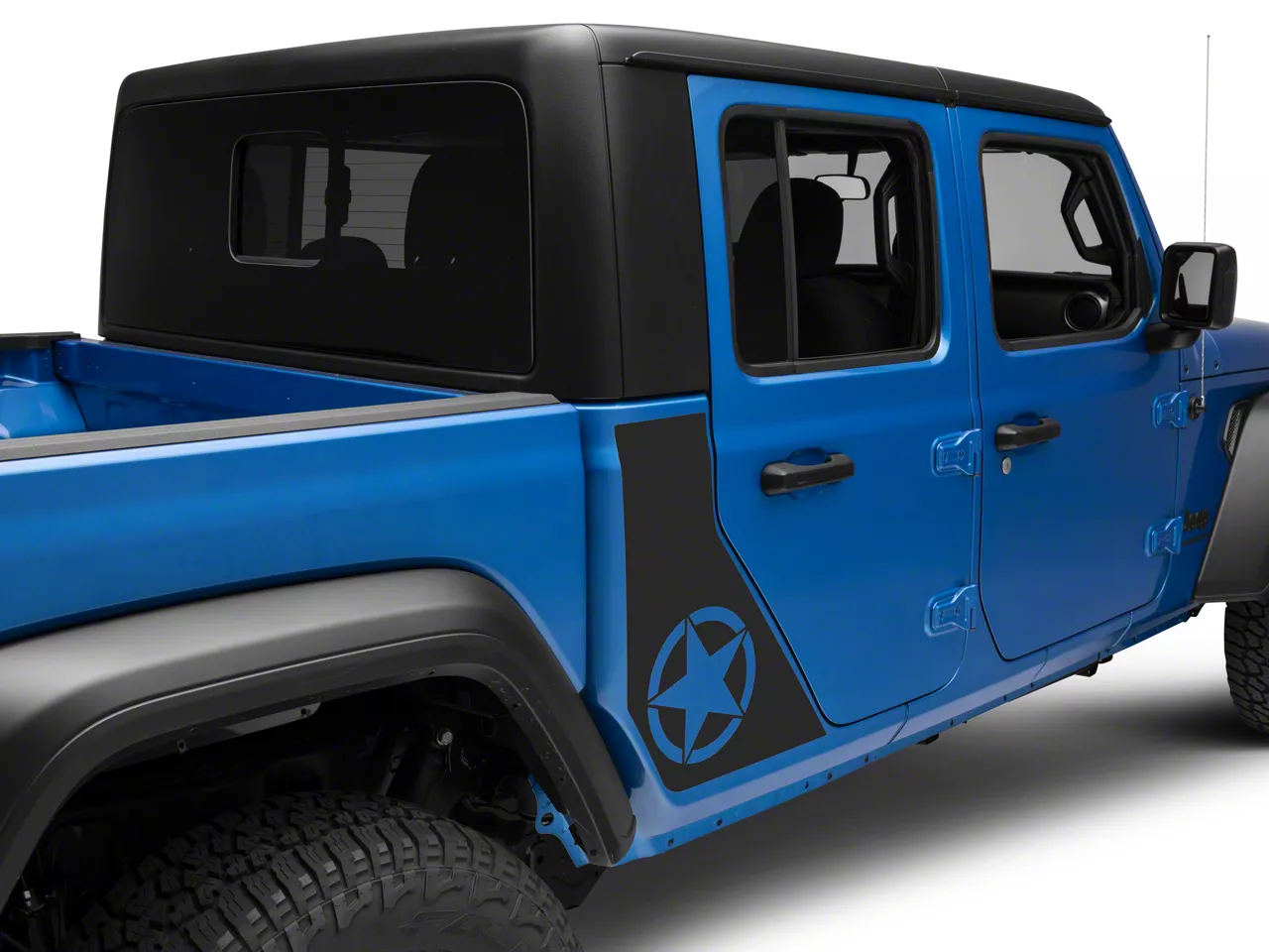 Application. These SEC10 Side Panel Star Decal; Matte Black are designed to fit 2020-2025 Jeep Gladiator JT models. Includes two decals.