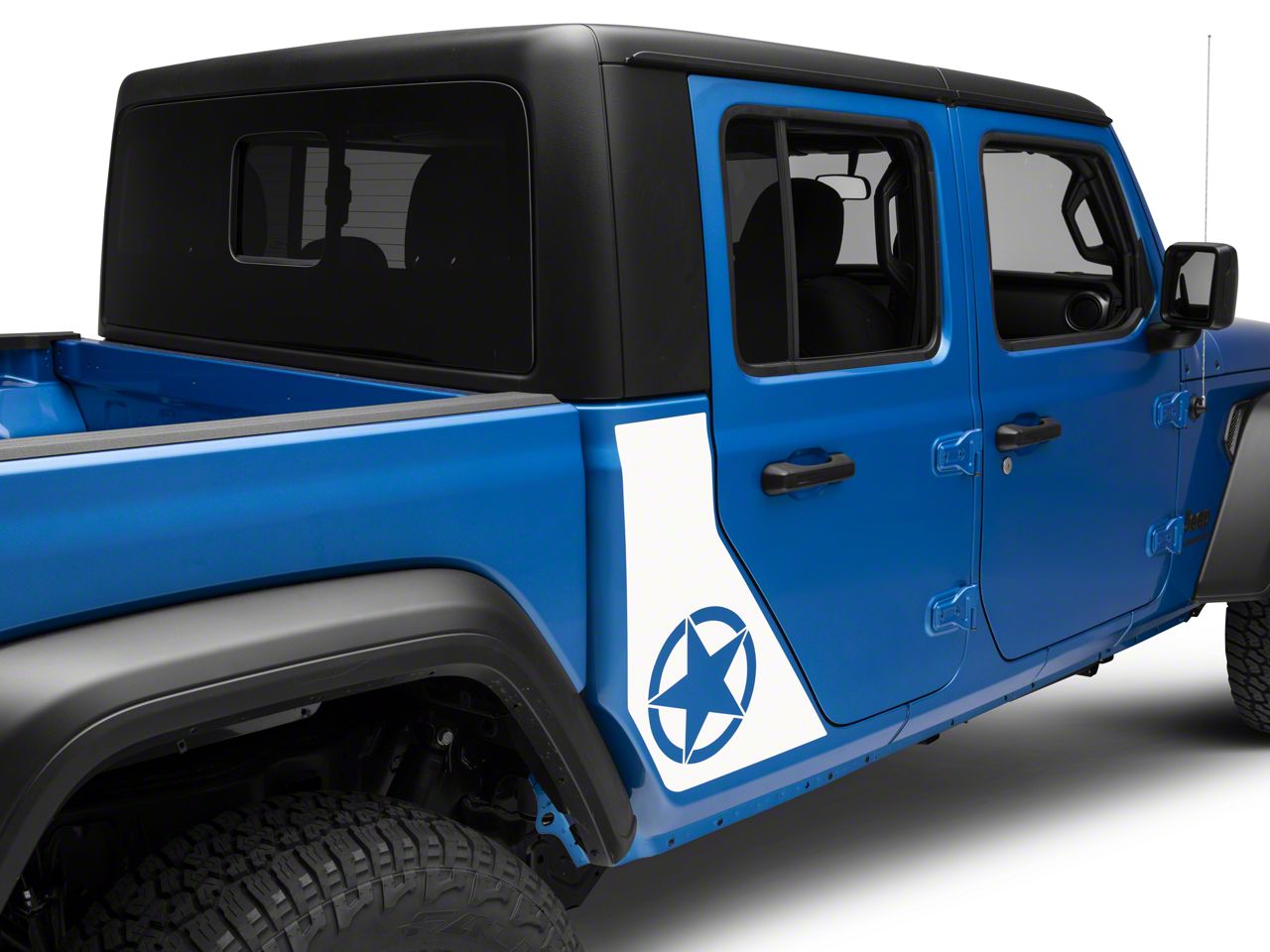 Side Panel Star Decals. Now you can add patriotic US Military styling to your Jeep Gladiator with this set of two white Side Panel Star Decals. Found on Oscar Mike special edition Jeeps, these Decals harken back to the second world war and were used to identify US vehicles from the ones that were already in use by the allied forces.