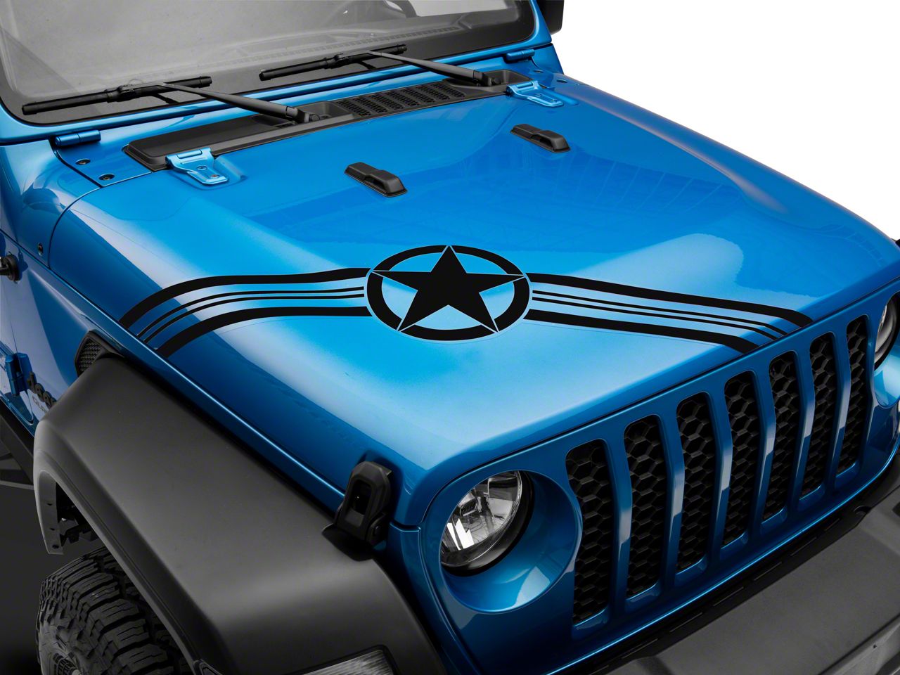 Stars and Stripes. Now you can add patriotic US Military styling to your Jeep Gladiator with this Stars and Stripes Accent Decal. Featuring three stripes with the Oscar Mike star in the center, this Decal harkens back to the second world war and was used to identify US vehicles from the ones that were already in use by the allied forces. This large black Stars and Stripes Accent Decal can be applied to any smooth flat surface and looks especially good across your Jeep's hood.