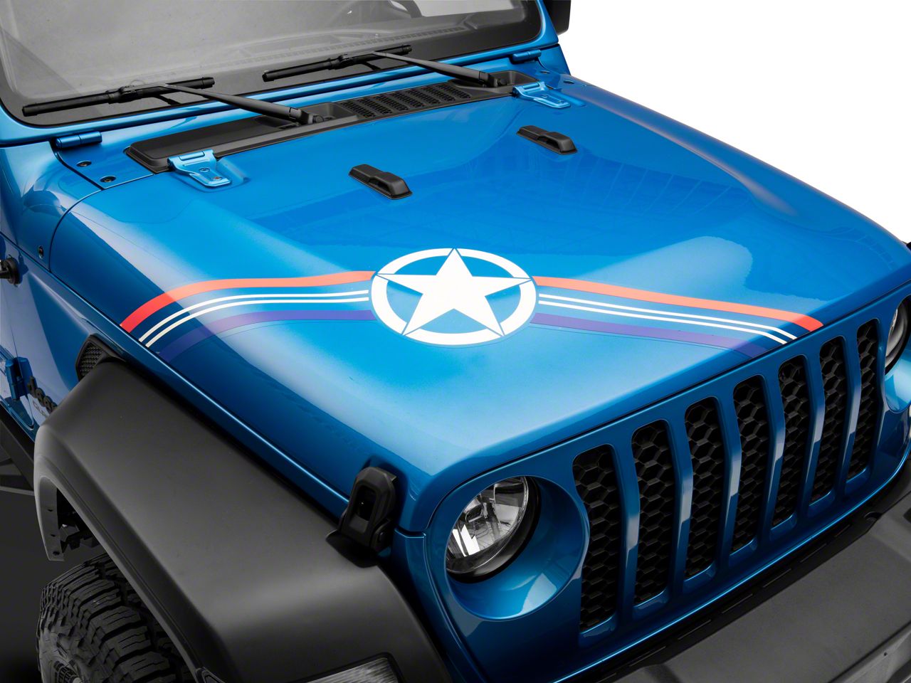 Stars and Stripes. Now you can add patriotic US Military styling to your Jeep Gladiator with this Stars and Stripes Accent Decal. Featuring three stripes with the Oscar Mike star in the center, this Decal harkens back to the second world war and was used to identify US vehicles from the ones that were already in use by the allied forces. This large red, white and blue Stars and Stripes Accent Decal can be applied to any smooth flat surface and looks especially good across your Jeep's hood.
