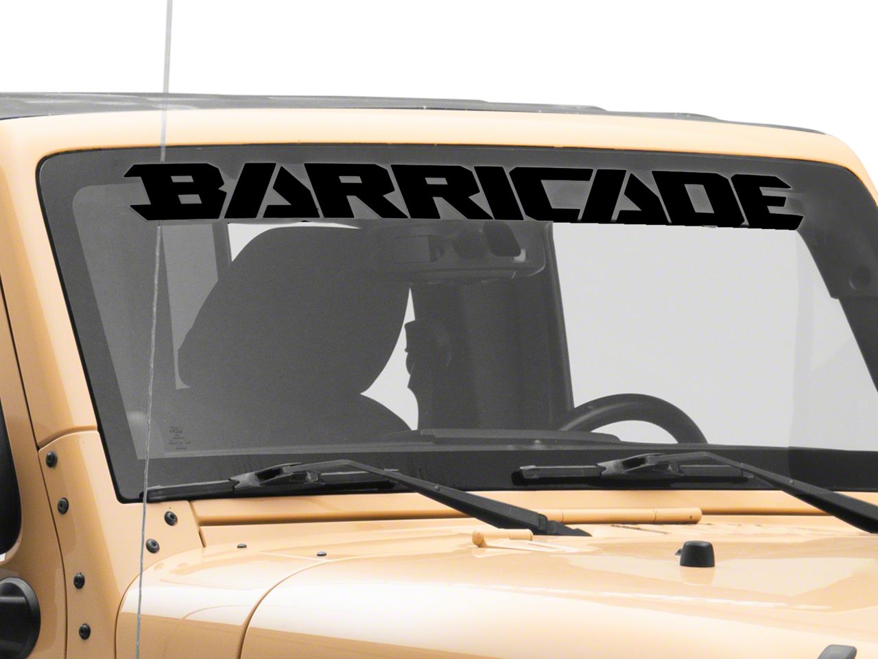 Application. This Barricade Windshield Decal; Black is designed to fit 2007-2018 Jeep Wrangler JK models. Measures - 43 Inch x 3 Inch. Sold individually.