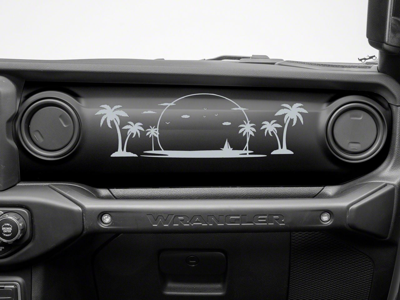 Beach Scene Dash Decal. Bring the great outdoors into the cabin your Wrangler with this great looking SEC10 Beach Scene Dash Decal. Designed to be applied to the passenger side dash, this decal features a calming tropical beach scene.