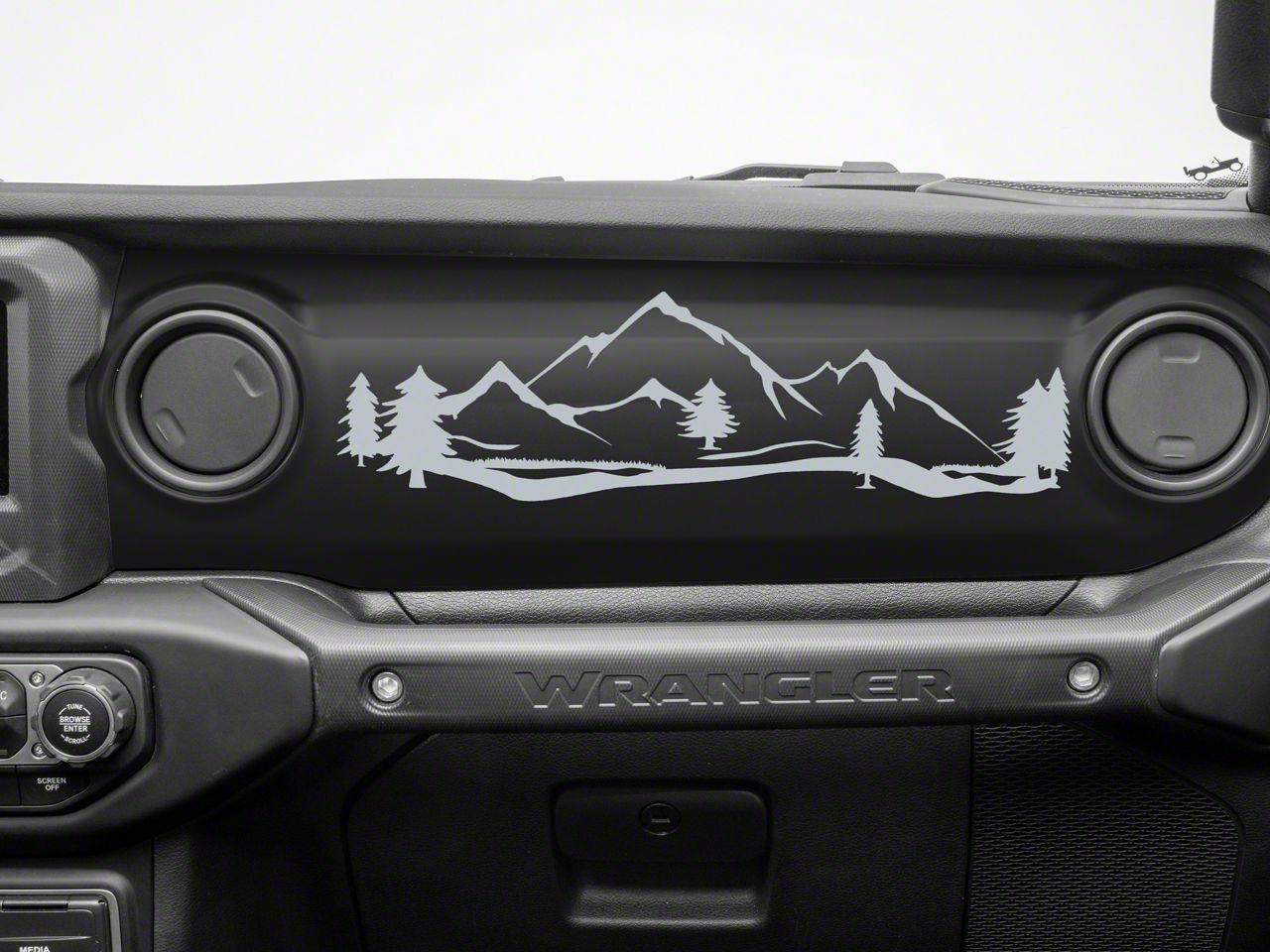 Mountain Scene Dash Decal. Bring the great outdoors into the cabin your Wrangler with this great looking SEC10 Mountain Scene Dash Decal. Designed to be applied to the passenger side dash, this decal features a majestic mountain range scene.