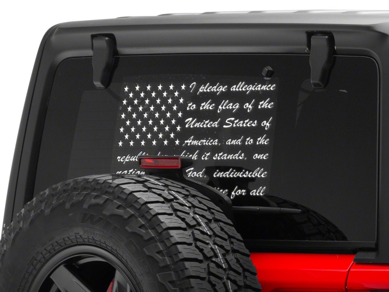 Pledge of Allegiance Flag Decal. Show that you are a proud American with this Pledge of Allegiance Flag Decal. Featuring the Pledge of Allegiance in an American Flag design, this Decal can be applied to any smooth flat surface and looks especially good in your rear/side windows or on your tailgate.