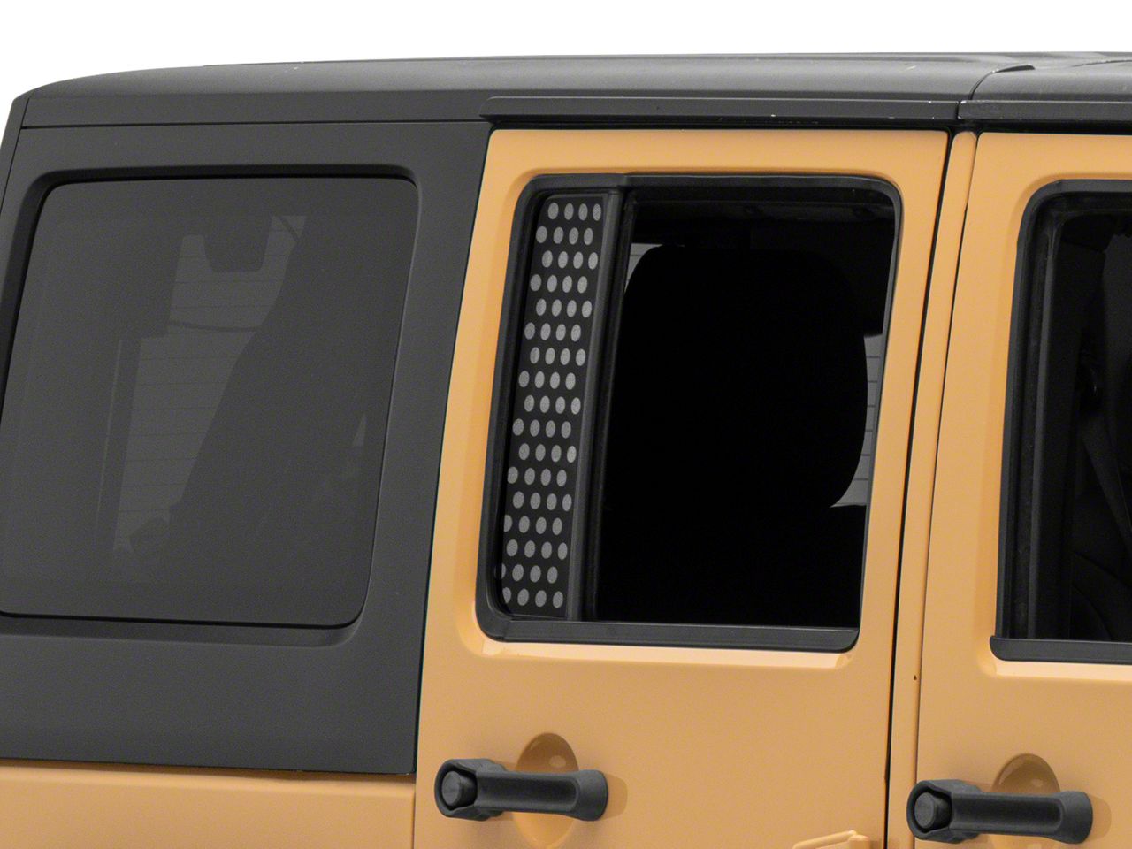 Rugged Styling. A simple and effective way to add rugged off-road styling to your 4-door Wrangler is with a set of Small Punched Rear Door Window Decals. These SEC10 Small Punched Rear Door Window Decals will give your Wrangler a more rugged appearance that looks great on the street or out on the trail.