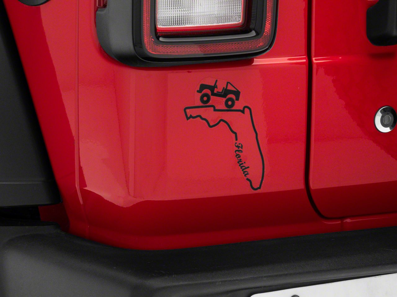 Florida Silhouette Decal. This decal shows the silhouette of the state of Florida with an all-terrain vehicle driving around the outline. This Florida Silhouette Decal can be applied to any smooth flat surface and looks especially good in your rear/side windows or on your tailgate.