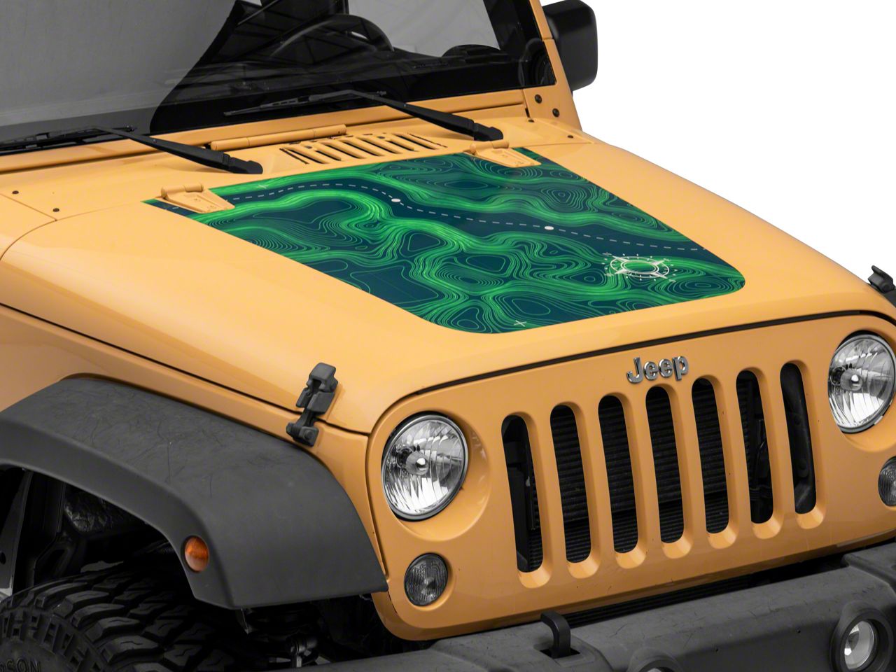 Application. This SEC10 Topographical Hood Decal; Green is designed to fit 2007-2018 Jeep Wrangler JK models.