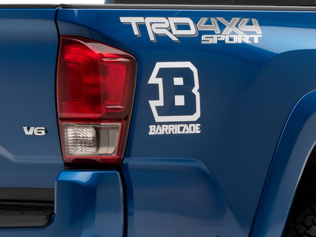 Barricade B-Block Decal. This great looking Barricade B-Block Decal is a simple and effective way to let everyone know exactly what parts you're running on your off-road rig. This Decal has a universal design, so it can be applied to any smooth flat surface and looks especially good in your rear/side windows or on your tailgate.