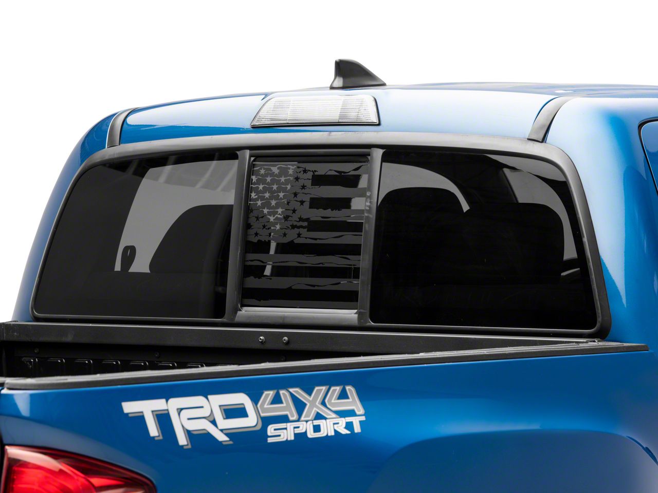Patriotic Styling. Now you can add patriotic styling to your Tacoma with this SEC10 Middle Rear Window Distressed American Flag Decal. Featuring a distressed American Flag design, this Middle Window Decal will proudly show off your patriotism.