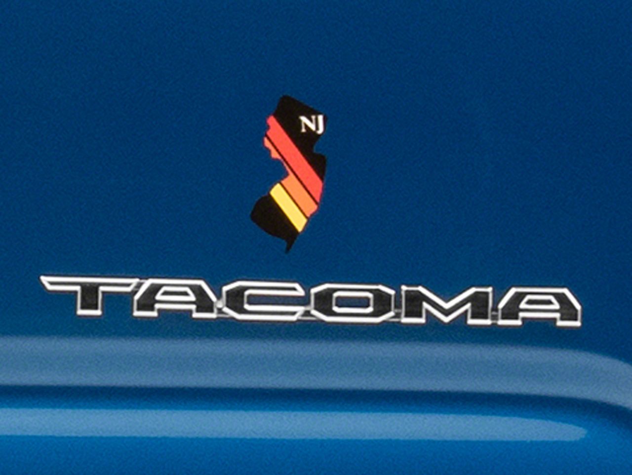 Tri-Color New Jersey Silhouette Decal. This decal shows the silhouette of the state of New Jersey with the iconic red, orange and yellow stripes of Toyota Racing running through it. This New Jersey Silhouette Decal can be applied to any smooth flat surface and looks especially good in your rear/side windows or on your tailgate.