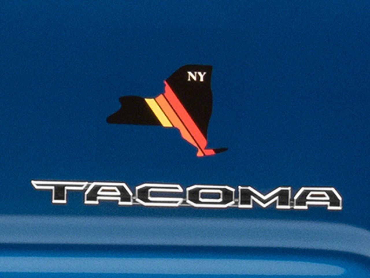Tri-Color New York Silhouette Decal. This decal shows the silhouette of the state of New York with the iconic red, orange and yellow stripes of Toyota Racing running through it. This New York Silhouette Decal can be applied to any smooth flat surface and looks especially good in your rear/side windows or on your tailgate.