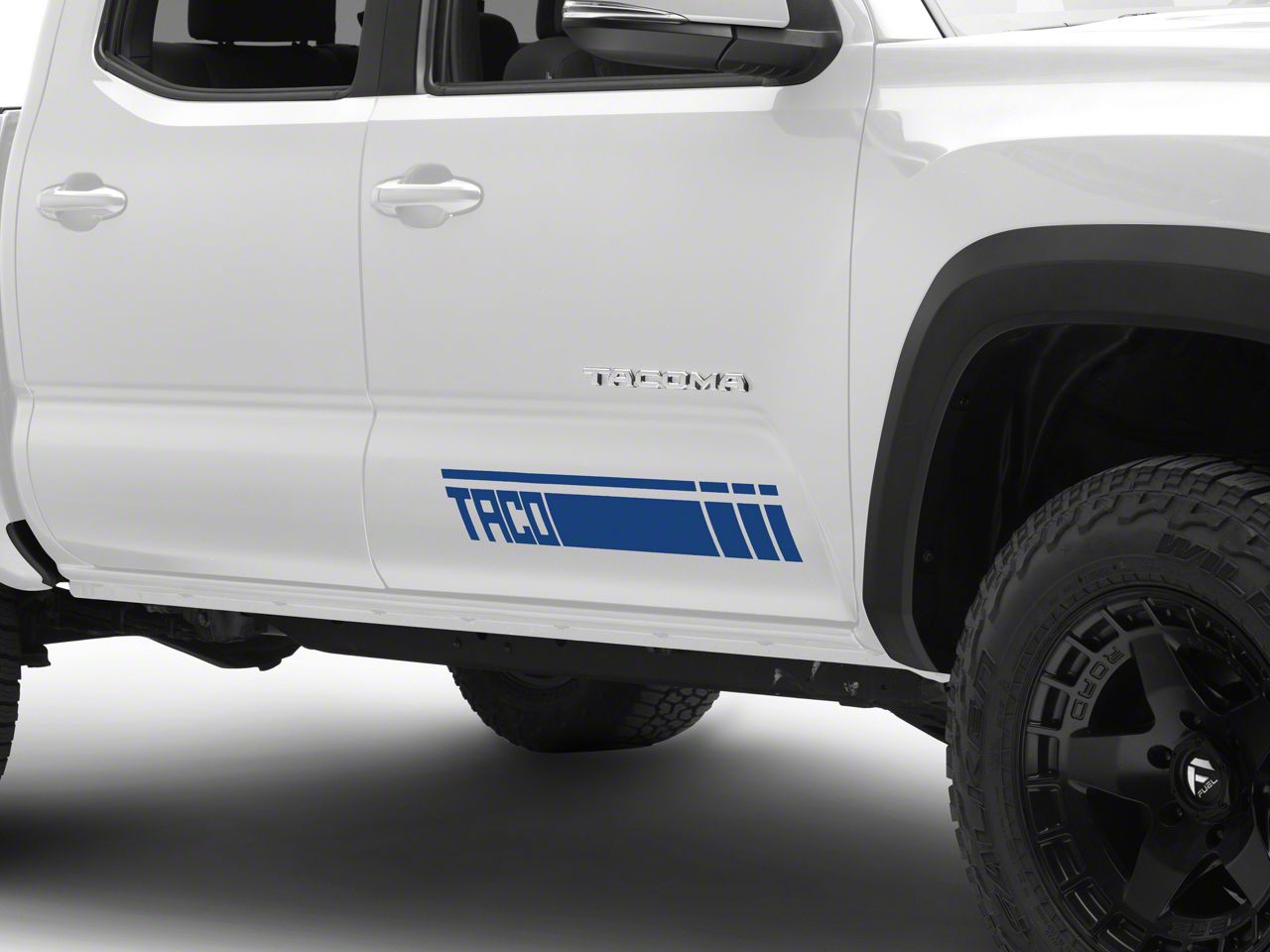 TACO Rocker Stripes. A simple and inexpensive way to personalize the exterior styling of your Tacoma is with a set of SEC10 TACO Rocker Stripe Decals. These SEC10 Rocker Stripe Decals feature a fading strobe design with the popular TACO moniker.