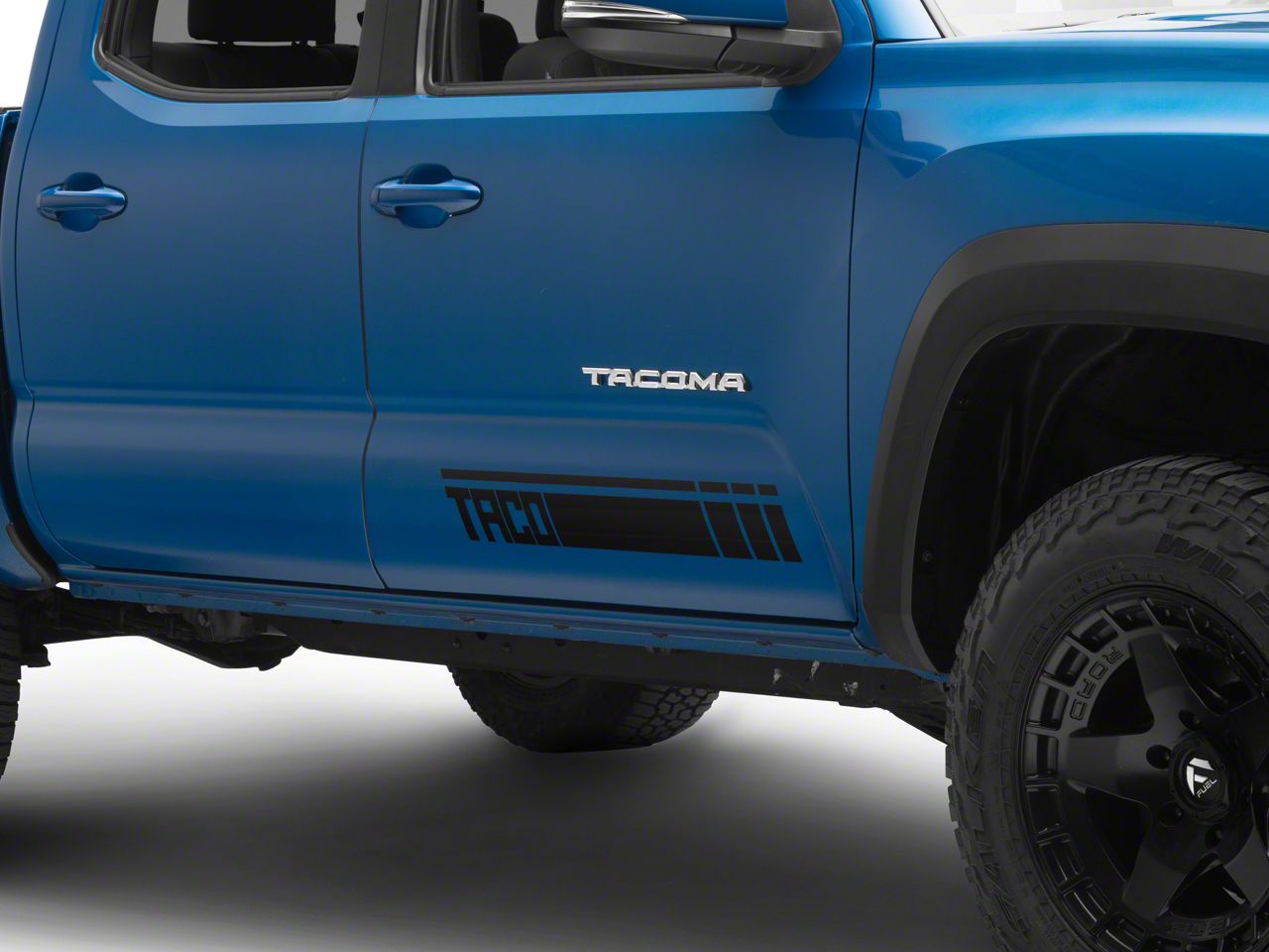 TACO Rocker Stripes. A simple and inexpensive way to personalize the exterior styling of your Tacoma is with a set of SEC10 TACO Rocker Stripe Decals. These SEC10 Rocker Stripe Decals feature a fading strobe design with the popular TACO moniker.