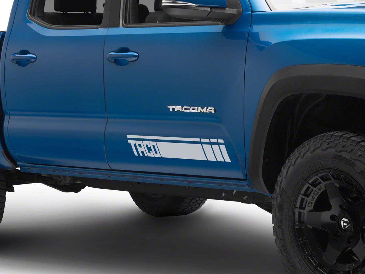 TACO Rocker Stripes. A simple and inexpensive way to personalize the exterior styling of your Tacoma is with a set of SEC10 TACO Rocker Stripe Decals. These SEC10 Rocker Stripe Decals feature a fading strobe design with the popular TACO moniker.