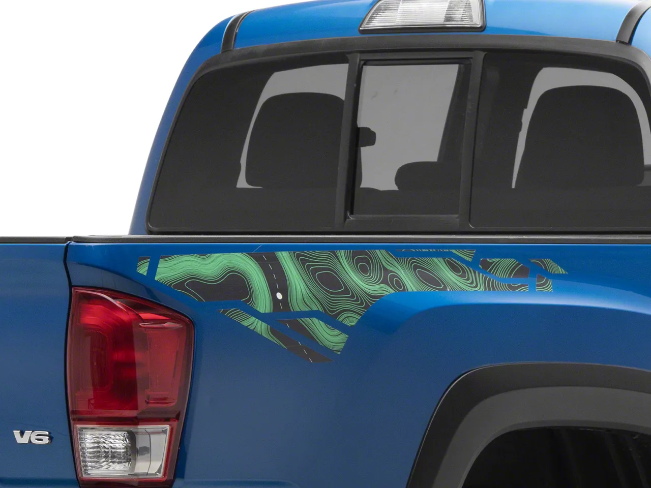 Application. These SEC10 Topographic Bed Side Graphics; Green are designed to fit 2016-2023 Toyota Tacoma models. Driver and passenger side included.