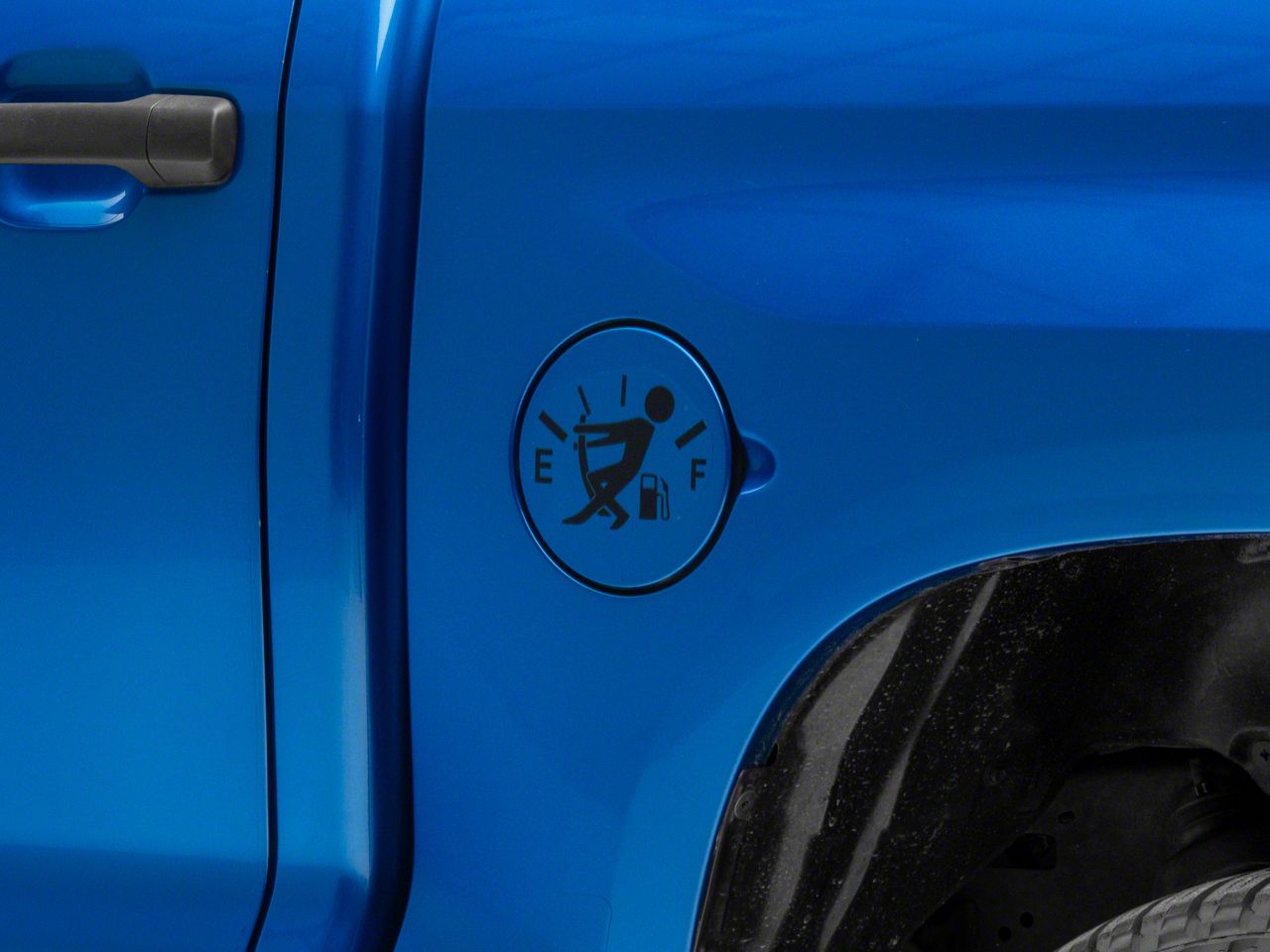 Empty Fuel Gauge Gas Guy Decal. This humorous decal shows the silhouette of a person fighting with the needle of their empty fuel gauge. This Decal can be applied to any smooth flat surface and looks especially good in your rear/side windows or on your tailgate.