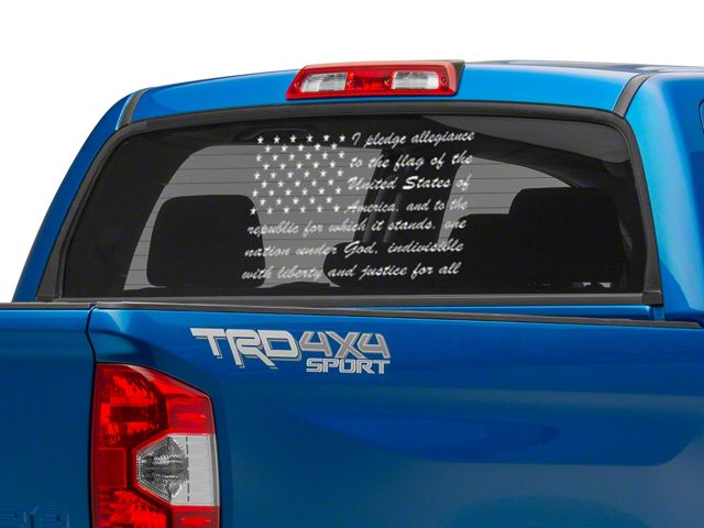 Pledge of Allegiance Flag Decal. Show that you are a proud American with this Pledge of Allegiance Flag Decal. Featuring the Pledge of Allegiance in an American Flag design, this Decal can be applied to any smooth flat surface and looks especially good in your rear/side windows or on your tailgate.