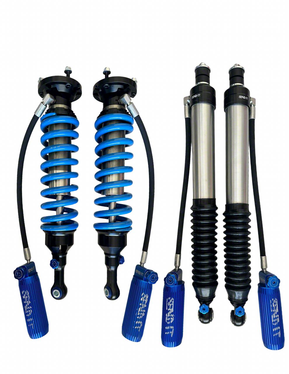 High-Performance Suspension Upgrade. The Send-It Suspension Coil-Over and Shock Suspension Kit is designed for 2005-2023 Toyota Tacoma models, offering an advanced Stage 2 upgrade for improved off and on-road performance. This kit includes blue front upper control arms, adjustable reservoir shocks, and coilover shocks, providing enhanced suspension capabilities for lifted vehicles.