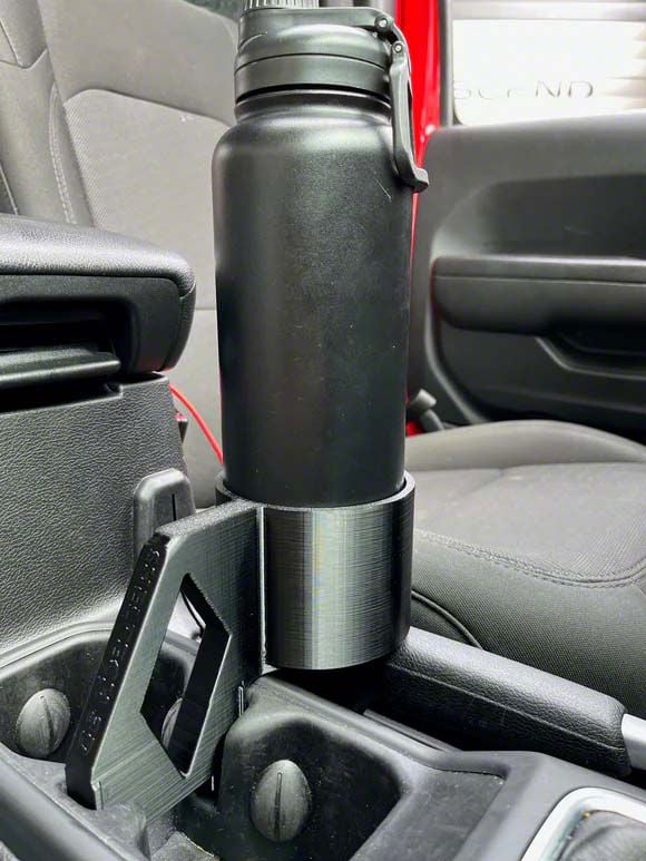 Convenient Extra Cup Holder. The Sheltech 3D 3rd Cup Holder (Black) is designed to provide an additional cup holder for your Jeep Wrangler JL, adding convenience during drives. Furthermore, it holds a large water bottle with a 3.6-inch inner diameter, making it perfect for long trips and keeping drinks secure.