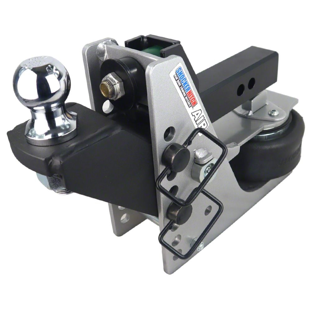 The smooth towing revolution of has started with the Shocker Streamline aluminum air receiver hitch with a Raised Ball Mount. This stout, lightweight yes strong aluminum hitch is rated for 10,000 lbs GTW. The air ride technology filters the bumps, bangs and towing jerks through the built-in air suspension bag and creates a safer, smoother towing experience. The road shock absorbing design natural reduces the tendency of trailer sway. This system features a raised ball mount attachment that comes with 2″ ball. Get air-ride trailer towing in minutes. The aluminum hitch frame, 2″ receiver shank, and paddle offer a rust-free design for years of smooth trailer towing performance and years of great looks. The air ride hitch with raised mount if often used on campers with higher trailer tongue but can be used on everything from towing boats, jet skis, snowmobiles, utv’s, utility trailers along with smaller car trailers. This aluminum air ride Shocker bumper hitch includes everything you need including the raise ball mount attachment along with 3 D-handle ball mount attachment pins with clips. If you are looking for other Ball Mount Attachments we offer a wide range including combo, drop, pintle, drawbar, clevis, pintle with ball along with several sway control bar tab options.The aluminum air ride bumper hitch has a 10,000 lbs tow rating capacity and a 1,000 lbs tongue weight. The aluminum Shocker Air provides the ultimate smooth ride. This shock-absorbing hitch with air spring bag is the best cushioning device on the planet. The Shocker Air is a miniature air suspension unit mounted between your truck and trailer. This Shocker mounts by sliding into a standard receiver tube. Fits Pickup Trucks, Vans, and Select SUV’s with the receiver hitch tube mounted underneath the bumper. Manufactured by Shocker Hitch® USA in Jamestown, ND.The air ride bag sits under the receiver tube allowing a short distance of 10 inches between the mounting pin and ball center. You will find the advantage of the Air Shocker is your ability to adjust air pressure for the best ride and load control. Great for pickup trucks.