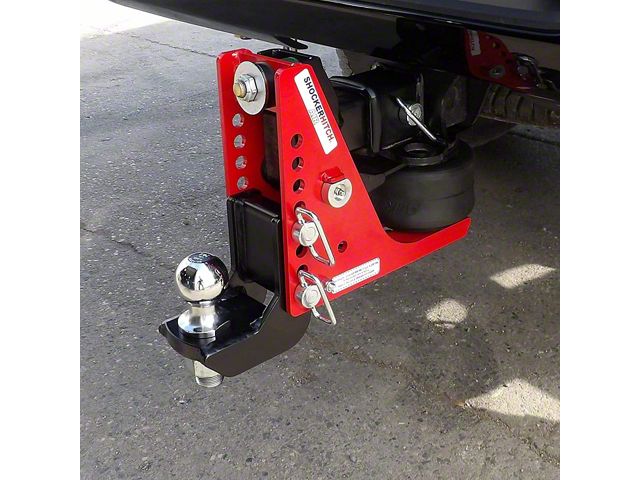 Description. Shocker air drop hitch adds instant air ride towing to your pickup and trailer. The Shocker Air Receiver Hitch with adjustable drop ball mount comes with a 2″ or 2-5/16″ hitch ball with a 4-1/2″ to 8-1/2″ Drop. 12,000 lbs tow rating capacity and 1,200 lbs tongue weight. The built in airbag cushions the hitch and absorbing the bumps, jerks, tugs and road shock with you are towing. Shocker air with drop hitch provides the ultimate smooth ride for taller pickups. The Shocker Air is a miniature air suspension unit mounted between your truck and trailer. This Shocker mounts by sliding into a standard receiver tube. The Shocker air with drop ball mount is great for taller pickup trucks. This shock absorbing hitch is a must have for smoother trailer towing.