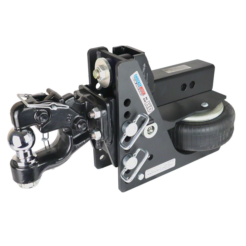 Tow in style and get everything you need to tow multiple trailers with the Shocker Max Black HD Air hitch and combination pintle & ball mount receiver hitch. This Textured Black HD Air hitch comes with an 8-ton combination pintle hook mount with a 2-5/16″ forged hitch ball. Eliminate having to always switch around mounts for different trailers. This combo pintle hook ball mount allows you to easily switch between a trailer ball to a pintle hook in a matter of seconds. The Shocker Air Pintle Receiver Hitch with combo pintle ball that has 8 Adjustment holes for an adjustable height of 2-1/2″ of Rise to 6-1/2″ Drop. The adjustable pintle design allows you to unbolt from the mounting plate and flip for additional rise or drop. Rated at 20,000 lbs tow capacity and 2,000 lbs tongue weight with the Shocker HD. Shocker air provides the ultimate smooth ride. The Shocker Air is a miniature air suspension unit mounted between your truck and trailer. This Shocker mounts by sliding into a standard receiver tube. This 8-Ton pintle hook fits 6″ OD x 3″ ID pintle rings. Works great on pickup trucks, vans and select SUV’s with receiver tube below the bumper. This military style air ride hitch comes in handy for pintle hitch trailer lowing. The air ride system sits under the receiver tube allowing a short distance of 10-inches between mounting pin and ball center. You will find the advantage of the combo pintle ball Air Shocker is your ability to adjust air pressure for best ride and load control. This adjustable pintle has a nice fix because of the design reducing slop and the built in airbag smooths out your towing. Fits standard 2 1/2″ receivers. Often used on farm applications, contractor trailers and off-road trailers. Manufactured by Shocker Hitch® USA in Jamestown, NDShocker Max Black HD: The Shocker Max Black HD is rated at 20,000 lbs towing capacity and 2,000 lbs tongue weight.Adjustable Combo Pintle Hook: 2-1/2″ of Rise to 6-1/2″ Drop. Cushioned adjustable combination pintle hook ball mount. Fits 6″ OD x 3″ ID pintle rings. 8-Ton 16,000 lbs Capacity. Comes with a 2-5/16″ hitch ball. Note: ( 2″Ball is 10,000 lbs GTW & 1,000 lbs TW / 2-5/16″ Ball is 16,000 lbs GTW & 1,600 lbs TW.)Air Ride Hitch: Shocker Air is designed with a built-in air ride system for a smoother towing experience. Featuring a built in height adjustment plus weight adjustable. Just add or ride air depending on the weight of your trailer and it’s contents.Provide Comfort: With a smoother ride! Travel a lot on concrete highways? No more jarring every time you cross a section divider. Your Shocker air hitch absorbs the thumps and bumps.Simple Pivot Design: uses a rocker arm pivot design which produces a down and back motion, much different than other air hitches on the market. Our design eliminates the need for slides, parallel linkages, rollers, shock absorbers, or multiple air ride systems common to other air hitches.Improves Safety: By giving you improved control of your tow vehicle and trailer. The air ride system receiver hitch system allows for better control of your pickup and the trailer it is towing.Shock Dampening Action: Shocker air hitch effectively absorbs the jerking, tugging and damaging forces experienced with a typical hard connection when towing trailers. There is no reason to beat yourself or your equipment up with a hard connection between your trailer and your receiver hitch.Saves Money: By reducing trailer breakage on both the trailer and the trailer contents! The Shocker hitch absorbs the damaging forces experienced with a typical hard connection. This greatly reduces the chances of breaking welds and doing other long term damage to your equipment as well as the valuable cargo you have inside the truck and trailer.Adds Life To Your Vehicle: By reducing wear and tear on driveline and frame! Treat yourself, your equipment, and your passengers to a much smoother ride. You’ll never go back to the ‘old days’ of continual bumps, jerks, and vibrations. Join the list of satisfied customers that are using Shocker hitches. Order one today and get ready for your ultimate smooth towing experience the next time out.Tons of Attachments: We offer a wide variety of our ball mount attachments; standard mounts, drop ball mounts, clevis mounts, drawbar mounts, cushioned drawbar mounts, combo ball, sway bar tab attachments, raised mounts and more.California Residents: Prop 65 Warning
