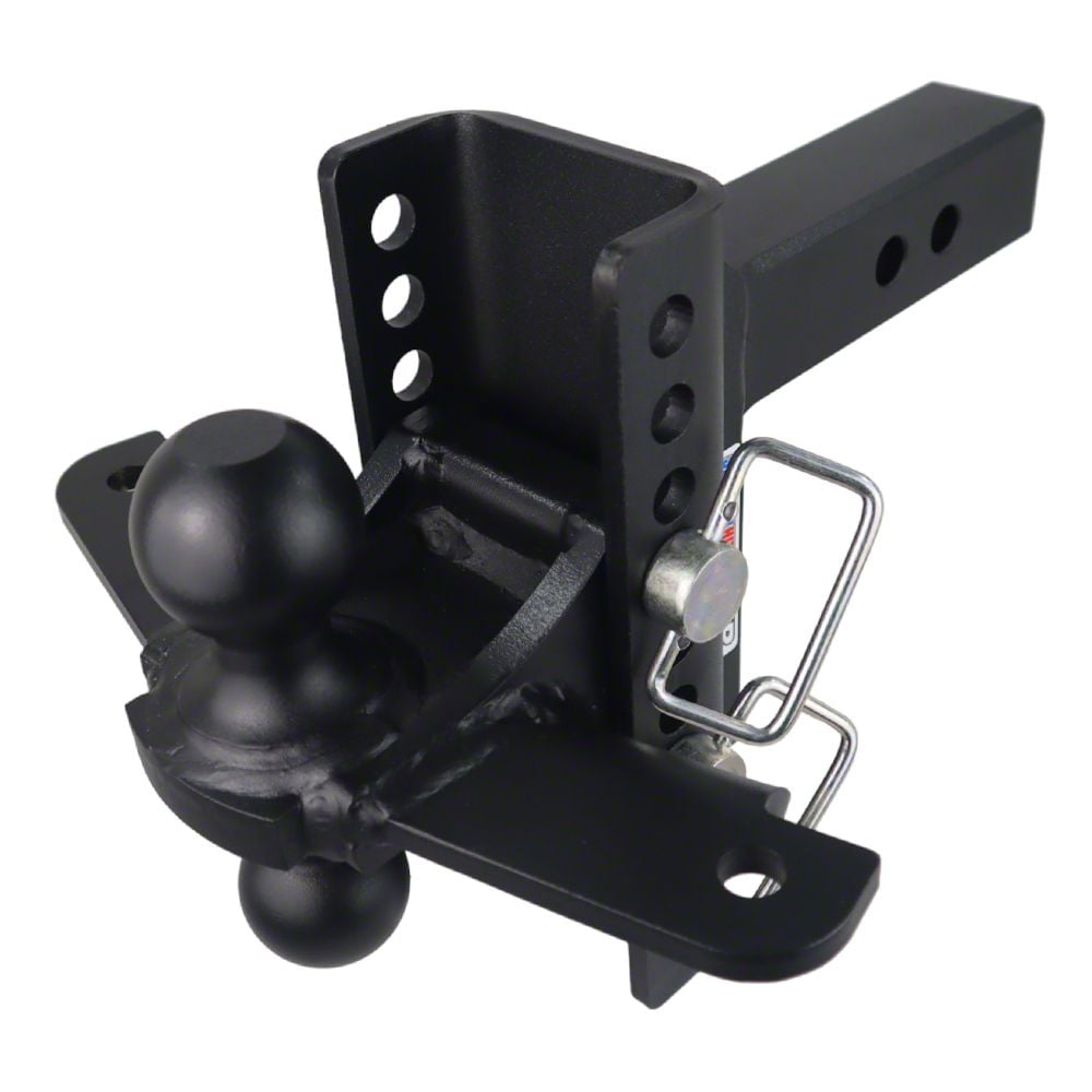 The Shocker XR drop hitch with adjustable combo ball hitch with sway bar mounting tabs comes with 2 ball mount attachment pins and safety clips. This adjustable & versatile design offers up to 12,000 lbs gtw along with up to 1,200 lbs tongue weight along with 5.5" of rise to 5.5" of drop. If sway is an issue and you need an economical solution, this is it.  The sway control combo ball works with all our SH-1001 friction sway control kits which are available and sold separately. The XR has built-in adjustability and maximum versatility for your towing needs. Plus the hitch can be flipped around for more drop or rise. The welded sway bar mount tabs with holes are great for using with friction sway control bar kits such as the SH-1001. The sway bar tabs are for use with sway control kits such as the Shocker friction sway control arm bar kit (or similar) to reduce trailer sway. It also features two hitch pin holes for length adjustment, as well as making it compatible with hitch mount towing mud flaps & rock guards. Black powder-coat combo hitch balls. Made by Shocker Hitch® USA. XR Hitch as a premium textured matte black powder coat finish and the combo mount with sway tabs a textured powder coat finish for resistance to the elements. Desinged to for 2" Receiver hitch. With the combo adjustable ball mount, the trailer hitch balls are manufactured together featuring 2 welded on sway bar mounting tabs, with a premium matte black impact resistant powder coat finish on the base for resistance to corrosion.