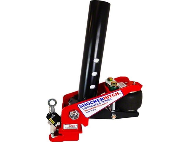 Description. The Gooseneck Surge air hitch & coupler adds instant air ride to your gooseneck trailer. This gooseneck air hitch is the only air ride hitch to exclusively work in a forward and back motion, which is often times this is the biggest jerk, tug and bang you feel when towing gooseneck trailers. The Shocker air gooseneck surge hitch directs the tow resistance through the airbag, producing a way smoother ride and towing experience. The Gooseneck Surge hitch is the ultimate hitch for gooseneck trailers. It provides smooth and safe towing experience. Featuring the exclusive patent pending Shift Lock gooseneck coupler with 30,000 lbs tow & 6,000 lb tongue weight rating.
