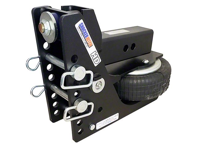 Description. The Shocker HD Max Black Air Bag Receiver Hitch base frame only. Includes everything except the ball mount attachment. Comes complete with Shocker HD matte black base frame assembly with build in HD airbag & 2 d-handle ball mount pins with clips. (No ball mount attachment included) Ball mount attachments available & sold separately. 20,000 lbs tow rating capacity and 2,000 lbs tongue weight. Shocker HD air provides the ultimate smooth ride. The Shocker HD Air is a miniature air suspension unit mounted between your truck and trailer. This Shocker mounts by sliding into a standard receiver tube. Choose from combo ball, cushion draw bar, pintle hook, adjustable and drop style ball mounts, which are sold separately.