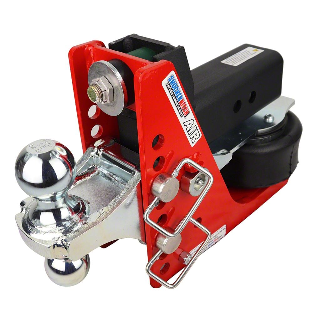 Add instant air ride towing to your pickup and trailer with the Shocker Air Receiver Hitch with adjustable combo ball mount with both a 2" hitch ball and a 2-5/16" hitch ball with a 1/2" to 4-1/2" Drop. 12,000 lbs tow rating capacity and 1,200 lbs tongue weight. Shocker Hitch air provides the ultimate smooth ride. This shocker absorbing hitch is a miniature air suspension unit mounted between your pickup truck and trailer that channels the road shock through the built in airbag. This shock absorbing ball mount takes the bumps, jerks, tugs and roughness out of trailer towing and cushions your ride and overall towing experience. This Shocker mounts by sliding into a standard receiver tube. The combo multi-ball mount features welded hitch balls for superior strength and the combo ball mount comes in a clear zinc plated finish. Works great on pickup trucks.The air bag sits under the receiver tube allowing a short distance of 10-inches between mounting pin and ball center. You will find the advantage of the Air Shocker is your ability to adjust air pressure for best ride and load control. Fits standard 2" receiver tube, 2 1/2" and 3" receivers.Air Ride Hitch: Shocker Air is designed with a built-in air bag for a smoother towing experience. Featuring a built in height adjustment plus weight adjustable. Just add or ride air depending on the weight of your trailer and it's contents.Provide Comfort: With a smoother ride! Travel a lot on concrete highways? No more jarring every time you cross a section divider. Your Shocker air hitch absorbs the thumps and bumps.Simple Pivot Design: uses a rocker arm pivot design which produces a down and back motion, much different than other air hitches on the market. Our design eliminates the need for slides, parallel linkages, rollers, shock absorbers, or multiple air bags common to other air hitches.Choose from the Original Shocker Air and the Shocker HD. Original is rated at 12,000 lbs towing capacity and 1,200 lbs tongue weight. The Shocker HD is 20,000 lbs towing capacity and 2,000 lbs on tongue weight.Tons of Attachments: We offer a wide variety of our ball mount attachments; standard mounts, drop ball mounts, clevis mounts, drawbar mounts, cushioned drawbar mounts, pintle hook attachments, raised mounts and combo multi-ball mounts.Improves Safety: By giving you improved control of your tow vehicle and trailer. The air bag receiver hitch system allows for better control of your pickup and the trailer it is towing.Shock Dampening Action: Shocker air hitch effectively absorbs the jerking, tugging and damaging forces experienced with a typical hard connection when towing trailers. There is no reason to beat yourself or your equipment up with a hard connection between your trailer and your receiver hitch.Saves Money: By reducing trailer breakage on both the trailer and the trailer contents! The Shocker hitch absorbs the damaging forces experienced with a typical hard connection. This greatly reduces the chances of breaking welds and doing other long term damage to your equipment as well as the valuable cargo you have inside the truck and trailer.Adds Life To Your Vehicle: By reducing wear and tear on driveline and frame! Treat yourself, your equipment, and your passengers to a much smoother ride. You’ll never go back to the ‘old days’ of continual bumps, jerks, and vibrations. Join the list of satisfied customers that are using Shocker hitches. Order one today and get ready for your ultimate smooth towing experience the next time out.The air bag sits under the receiver tube allowing a short distance of 10-inches between mounting pin and ball center. You will find the advantage of the Air Shocker is your ability to adjust air pressure for best ride and load control. Fits standard 2" receiver tube, 2 1/2" and 3" receivers.Air Ride Hitch: Shocker Air is designed with a built-in air bag for a smoother towing experience. Featuring a built in height adjustment plus weight adjustable. Just add or ride air