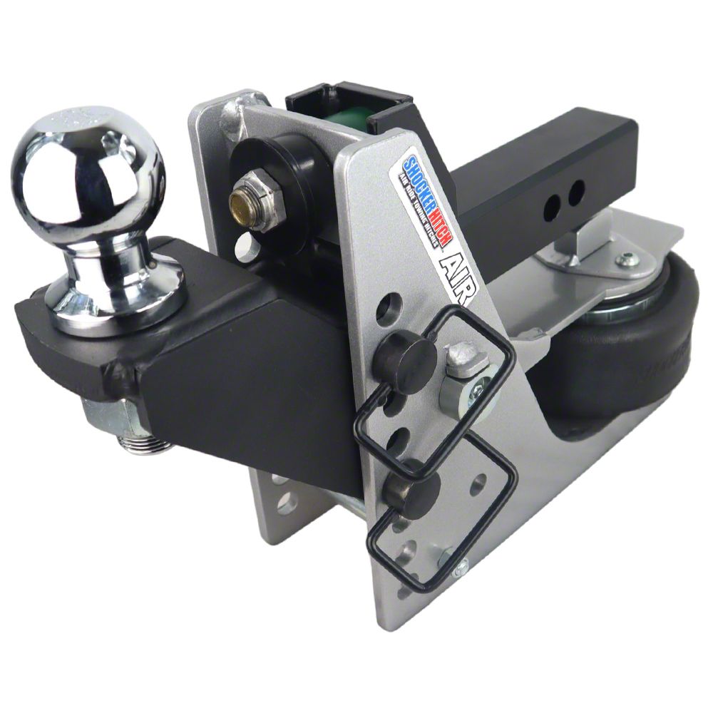 Advanced Towing Solution. Elevate your towing experience with the Shocker Hitch Receiver Hitch and Raised Ball Mount. This hitch system is designed to handle a maximum gross trailer weight of 10,000 pounds and a maximum tongue weight of 1,000 pounds, making it suitable for a wide range of towing applications. The unit features a matte black and polished chrome finish for durability and style. Its unique design incorporates a built-in shock absorbing air spring bag with dual rubber bump cushions, which effectively eliminates tugs, thumps, jerks, and bumps, enhancing overall towing smoothness and safety.