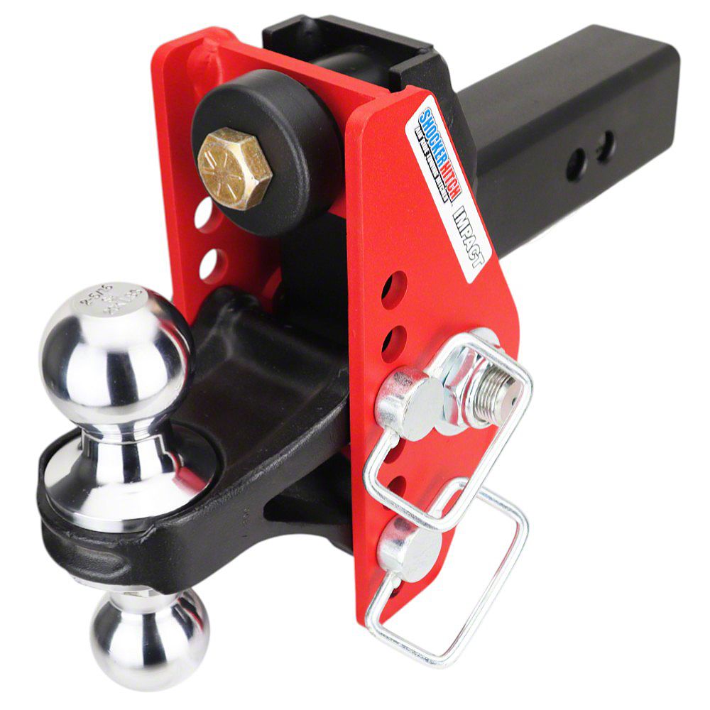 The Shocker Impact cushion hitch with adjustable chrome combo ball mount is designed for heavy duty to cushion the towing experience and create a smooth ride. Great for contractors, boat owners, enclosed trailers, campers, car trailers and even motorhomes. The pivoting, shock absorbing dual bump cushioning design is heavy duty and can handle the rough roads and give you a smooth tow. The bumps and bangs and filtered through the double cushions and the unique flip around design, allows you to flip the entire hitch around for more drop or rise. The adjustable chrome combo multi-ball mount has both a 2" hitch ball and a 2-5/16" hitch ball. This shocker absorbing combo hitch gives you 4" of rise to 4" of drop. Combo ball mount offers versatility for towing trailers with 2" or 2-5/16" ball couplers and features a safety red impact resistant textured durable powder coat finish. Shocker Impact cushioned hitch ball mount provides the ultimate in versatility and a smoother towing experience than a solid ball mount. The Impact ball mount has built in adjustability maximum versatility with 7 adjustment holes for your towing needs. Works great on motorhomes, rv's, pickup trucks, full size vans, suvs, cuvs and minivans. 2 hitch pin holes to adjust the length and there is plenty of room on the receiver shank to accommodate hitch mounted towing mud flaps or shocker bumper tow flaps. Use this adjustable ball mount however you need to for tons of versatility. This Shocker Impact cushioned combo ball mount attaches by sliding into a standard receiver tube. 14,000 lbs tow rating capacity and 1,400 lbs tongue weight. Fits 2-1/2" reciever hitch Shank.