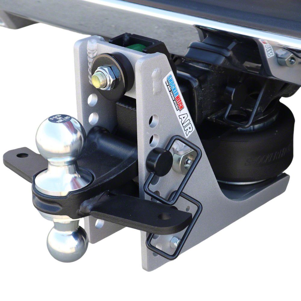 The Shocker Streamline aluminum air hitch with Sway combo ball is the next generation in towing. Thick, strong, yet lightweight aluminum makes it easy to take in and out of your receiver hitch & strong yet strong enough to pull 10,000 lbs. This air ride hitch system includes an aluminum hitch with premium powder coated black base with chrome dual combo ball that has a 2" hitch ball and 2-5/16" ball can pull up to 10,000 lbs and combo ball mount attachment with welded on sway bar mounting tabs is made for the basic friction sway control arm/bars with mini hitch ball. Get air ride trailer towing in minutes. The built in air spring bag absorbs the rock shock and creates a way smoother towing experience. If trailer sway is a probably, this is the hitch for you. Great for towing boats, smaller campers, utility trailers, snowmobile trailers, fish houses, jet skis, and more. The aluminum hitch frame, 2" receiver shank, and paddle offer a rust-free design for years and years, for great looks on your pickup or SUV. The Shocker 10k Aluminum Air Hitch base frame includes everything, including d-handle, black ball mount attachment pins, and the dual combo ball. If you are looking for other Ball Mount Attachments, we offer a wide range, including combo with sway bar tabs, drop with sway bar tabs, raise mount or raised mount with sway tabs, and much more.The aluminum air hitch has a 10,000 lbs tow rating capacity and a 1,000 lbs tongue weight. The aluminum Shocker Air provides the ultimate smooth ride. This shock-absorbing hitch with air ride bag is the best cushioning device on the planet. The Shocker Air is a miniature air suspension unit mounted between your truck and trailer. This Shocker mounts by sliding into a standard receiver tube. Fits Pickup Trucks, Vans, and Select SUV's with the receiver hitch tube mounted underneath the bumper. Manufactured by Shocker Hitch® USA in Jamestown, ND.The air spring bag sits under the receiver tube allowing a short distance of 10 inches between the mounting pin and ball center. You will find the advantage of the Air Shocker is your ability to adjust air pressure for the best ride and load control. Great for pickup trucks.