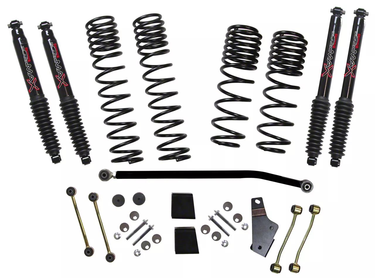 Innovative Lift. The SkyJacker 3.50-4 in. Dual Rate-Long Travel Lift Kit with Black MAX Shocks is a cutting-edge lift kit that features a spring coil that compresses and expands depending on the terrain you encounter. This all-inclusive kit has everything you need to give you up to 4 inches of lift. Specifically built for the 2018-2026 Jeep Wrangler JL 4-door (excluding Rubicon), you’ll get excellent highway performance as well as incredible off-road execution.