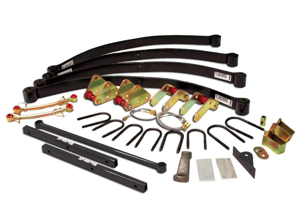 Durable Construction. Crafted to handle rugged trails, the SkyJacker Suspension Lift Kit gives your Wrangler an extra lift to get you over hills. Featuring 6" monolinear springs with 40-durometer rubber bushings, front and rear black max shocks, front greasable towbar shackles, rear boomerang shackles and brake lines allows your vehicle to truly handle rocky roads. The leaf spring makes your suspension lighter and smaller than a traditional setup for improved handling.