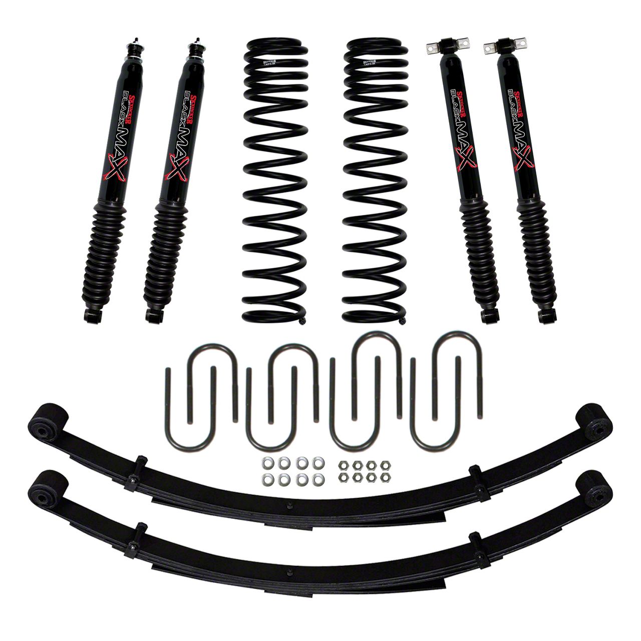 Quality Components. Crafted with rust-free and durable materials, this suspension lift kit is built to last. It includes rear leaf springs and Black MAX shocks, further enhancing the overall performance and handling of your vehicle. With all the necessary hardware included, installation is made easy.