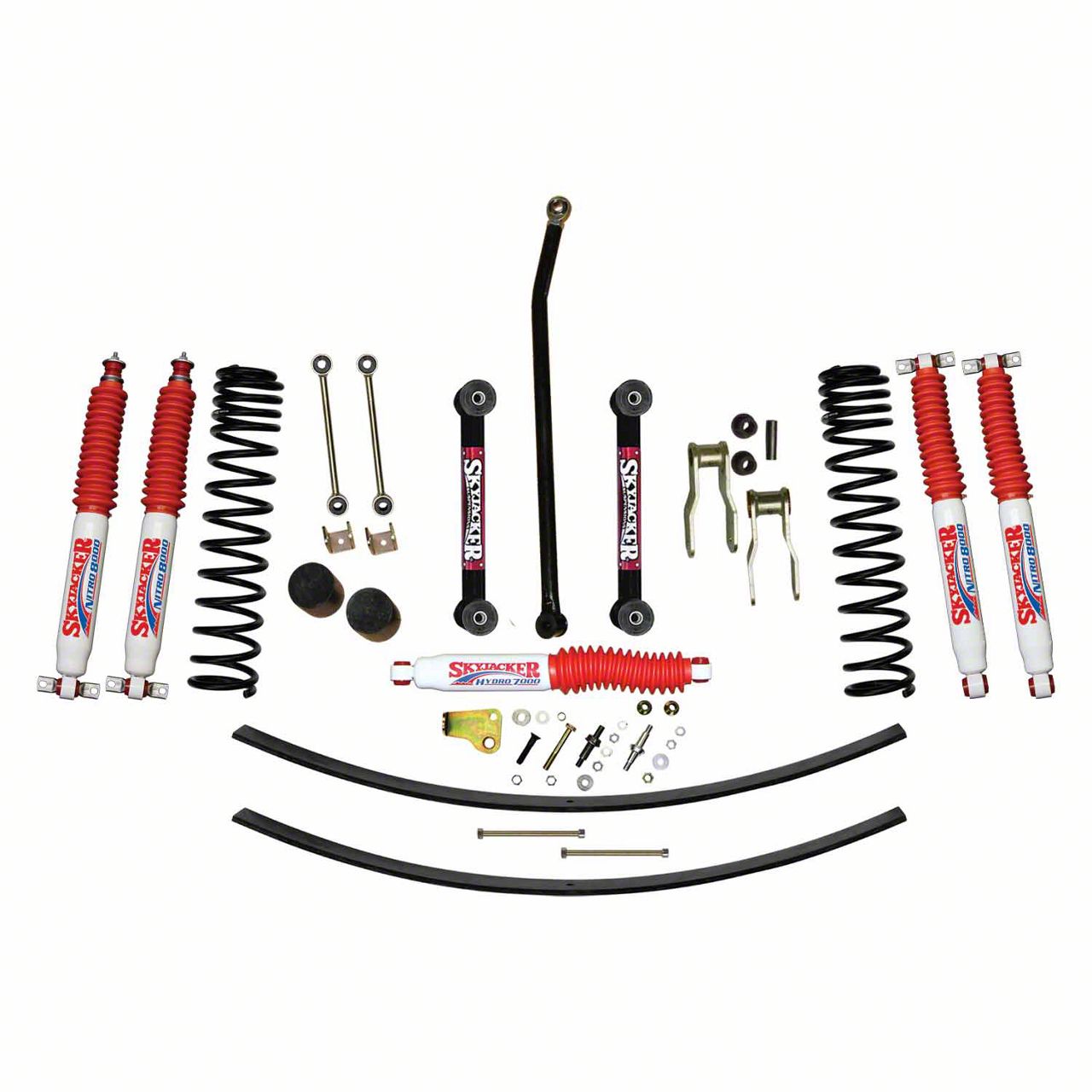 Fit. The design of the SkyJacker 4.50-Inch Front Dual Rate Long Travel Coil Suspension Lift Kit allows for wider tires, which can improve your Jeep's off-road performance even further. Larger tires are more stable and provide more traction on uneven ground, making it simpler to tackle challenging tracks.